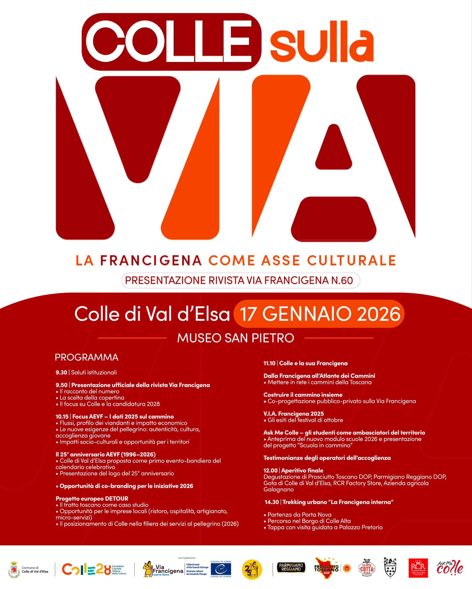 Presso il Museo San Pietro sarà presentato il numero 60 della rivista “Via Francigena”, che dedica uno speciale a Colle di Val d’Elsa, accompagnato da una serie di interventi che intrecciano dati, politiche culturali, welfare, turismo lento, giovani e imprese, nel percorso verso la candidatura di Colle Capitale Italiana della Cultura 2028.
