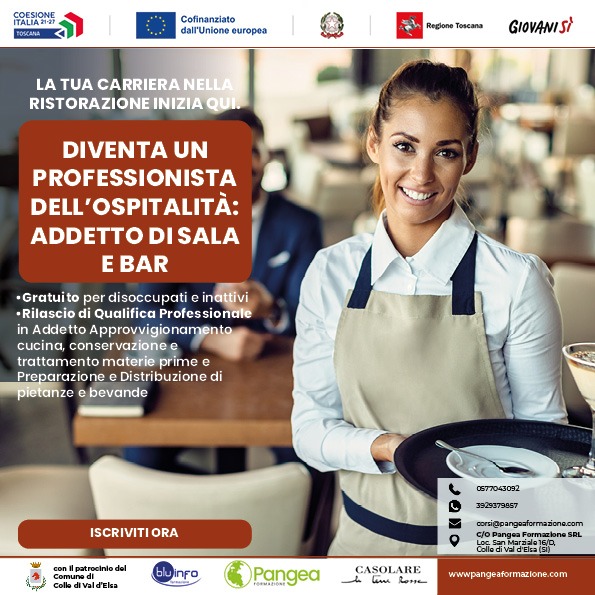 Si informa che sono aperte le iscrizioni ai corsi gratuiti “Professionisti dell’Ospitalità: Sala e Accoglienza”, promossi da Pangea Formazione Srl e finanziati dalla Regione Toscana nell’ambito del progetto Giovanisì.