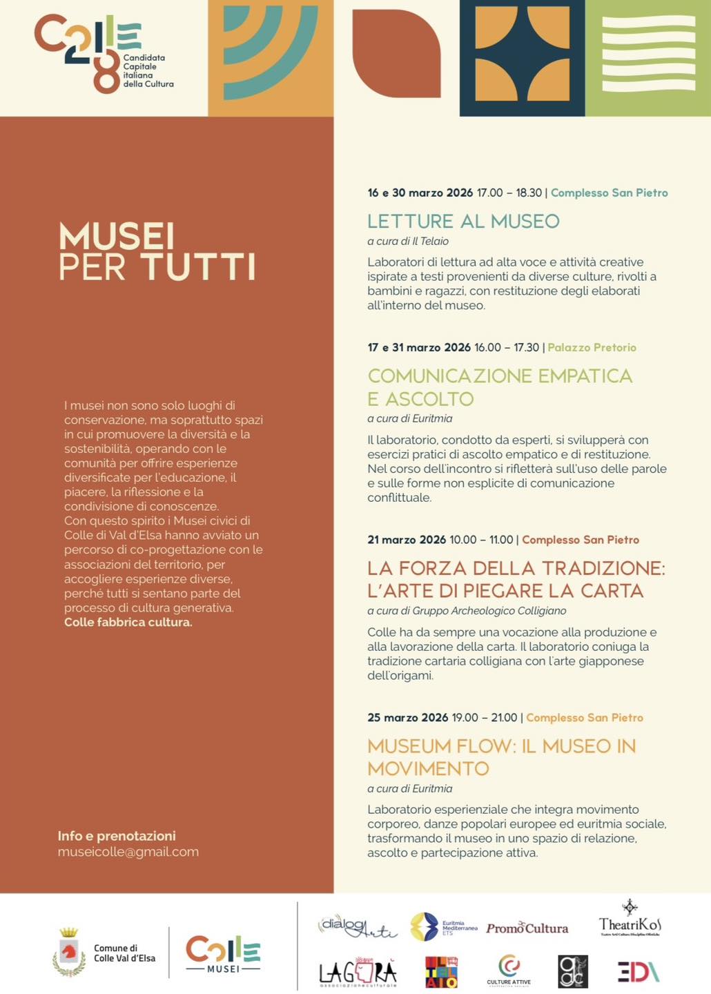 Lunedì 16 e martedì 17 marzo prenderanno il via le prime attività del progetto “Musei per tutti”, promosso dai Musei civici di Colle di Val d’Elsa per trasformare gli spazi museali in luoghi di partecipazione e crescita culturale aperti a tutta la comunità. Il percorso, realizzato in collaborazione con le associazioni del territorio, propone laboratori e iniziative pensate per coinvolgere pubblici di tutte le età.