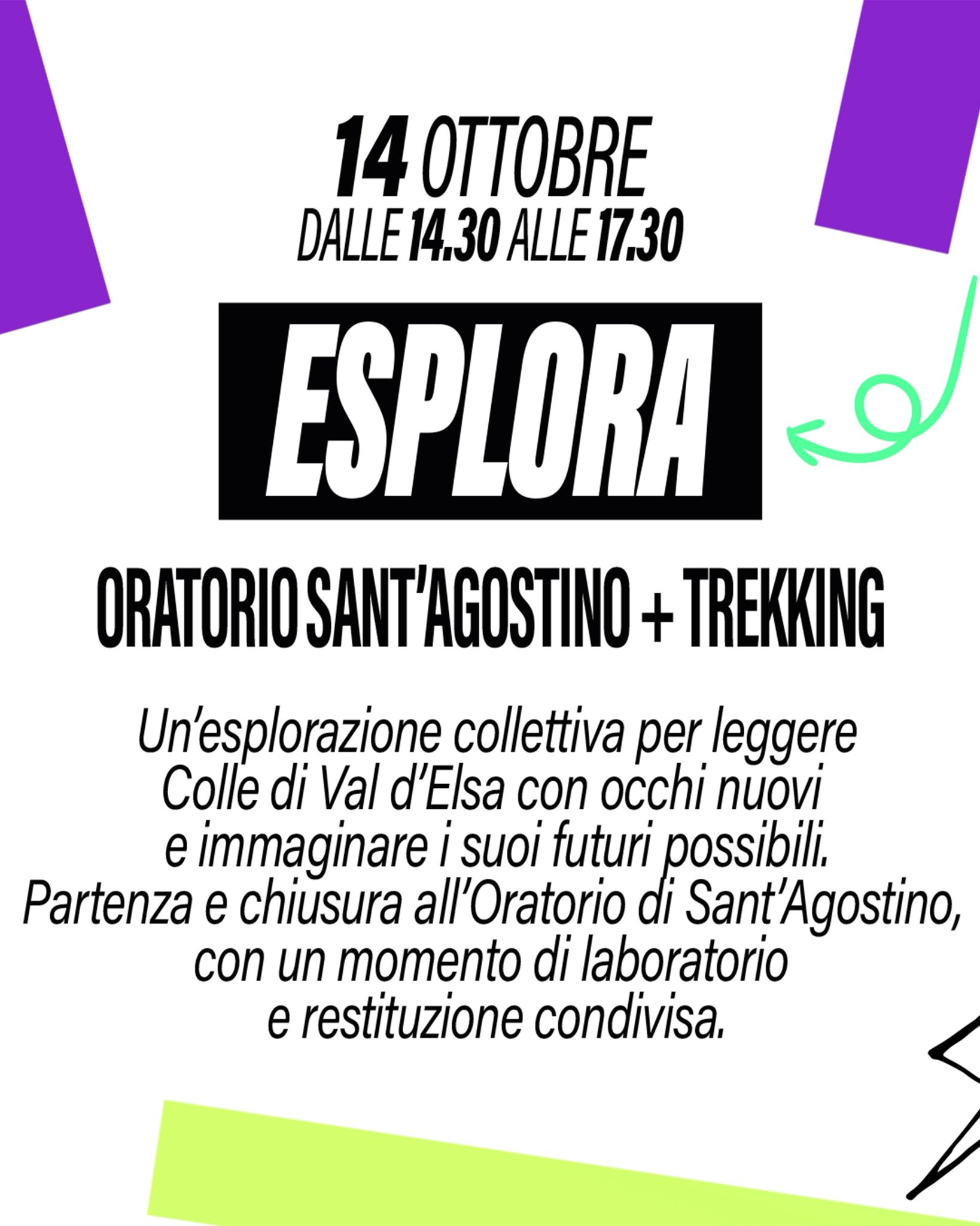 14, 20 ottobre e 3 novembre, nuovi appuntamenti nell’ambito del progetto ColleX: un’occasione per i giovani dai 12 ai 25 anni di far sentire la loro voce. Tre giornate per esplorare, osservare e immaginare Colle Val d’Elsa da un punto di vista nuovo: dal trekking urbano alla co-progettazione di idee per la città, fino alla costruzione del nuovo modello di governance per i ragazzi.