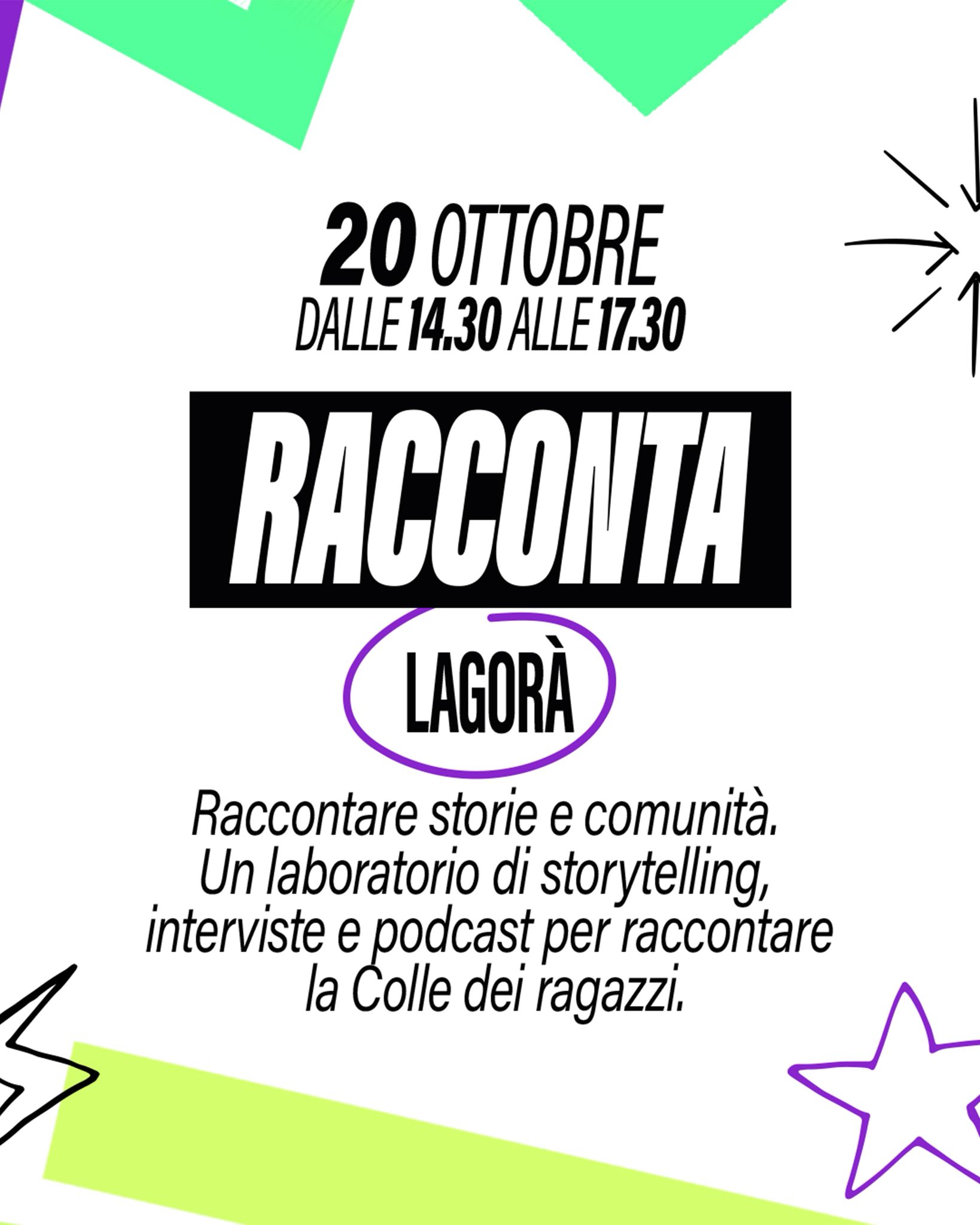 Il 20 ottobre si terra invece un laboratorio di storytelling, interviste e podcast per raccontare la Colle dei ragazzi.