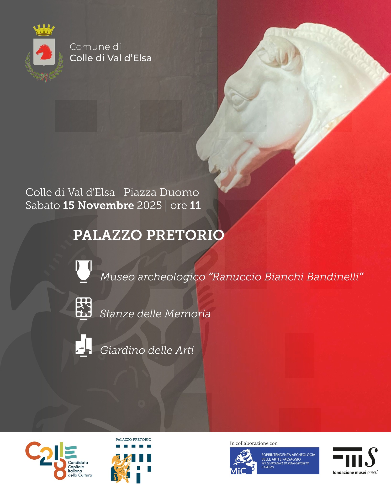 Sabato 15 novembre 2025, alle ore 11:00, si terrà la cerimonia di inaugurazione del rinnovato Museo Archeologico “Ranuccio Bianchi Bandinelli” di Colle di Val d’Elsa, ospitato nello storico Palazzo Pretorio in via del Castello 42. Dopo nove anni di chiusura per lavori di adeguamento e restauro, il museo riapre al pubblico completamente trasformato nel concept e negli allestimenti, restituendo alla comunità uno degli spazi più identitari e simbolici della città.
